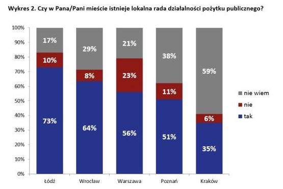 Co więcej, duża część organizacji pozarządowych w ogóle nie ma wiedzy dotyczącej funkcjonowania Rad Działalności Pożytku Publicznego. Na pytanie o to, czy w najbliższej okolicy funkcjonuje taka rada lub inny zespół służący utrzymywaniu stałej współpracy pomiędzy samorządem a sektorem pozarządowym, aż 22% organizacji odpowiada: „nie wiem”. O tym, że Rady Działalności Pożytku Publicznego dla wielu organizacji pozostają tworem kompletnie nieznanym świadczy przykład pięciu największych polskich miast: Warszawy, Krakowa, Łodzi, Wrocławia i Poznania. W każdym z nich funkcjonuje Miejska Rada Działalności Pożytku Publicznego. Tymczasem, w Krakowie o jej funkcjonowaniu wie nieco ponad jedna trzecia (35%) organizacji, a w Warszawie i Poznaniu nieco ponad połowa. Lepiej na tym tle wypada Wrocław, gdzie niemal dwie trzecie (64%) organizacji wie o istnieniu Miejskiej Rady Działalności Pożytku Publicznego, oraz Łódź, gdzie taką wiedzę ma prawie trzy czwarte (73%) stowarzyszeń i fundacji.