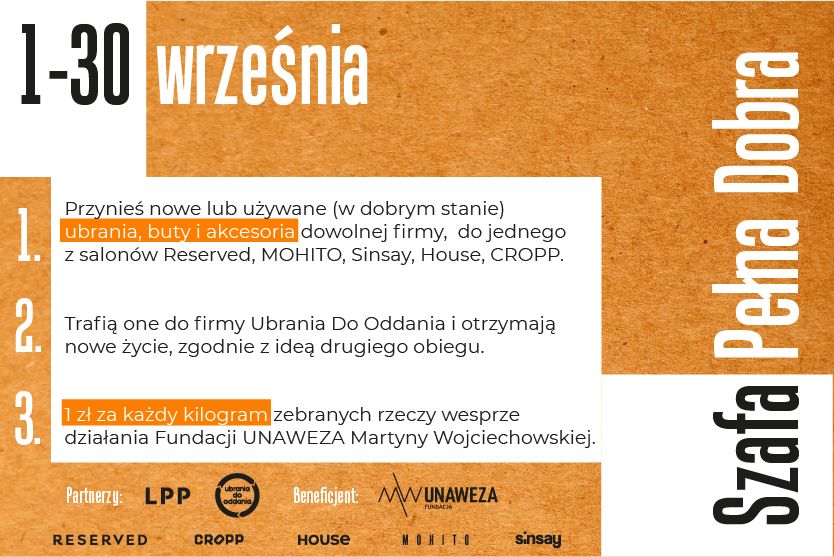 W ramach akcji „Szafa pełna dobra” przez cały wrzesień we wszystkich salonach marek LPP w Polsce będą zbierane nowe oraz używane ubrania i akcesoria. Odzież i dodatki dowolnej marki, ale w dobrym stanie, będzie można przynieść do każdego z blisko tysiąca sklepów Reserved, Mohito, Cropp, House czy Sinsay i zostawić w miejscu wskazanym przez sprzedawcę. W zbiórce można także wziąć udział zamawiając bezpłatnego kuriera, który odbierze przygotowaną paczkę np. z domu. W tym celu wystarczy założyć konto w serwisie ubraniadooddania.pl i postępować zgodnie z instrukcjami na stronie, wskazując jako beneficjenta, projekt „Szafa pełna dobra”. Zebrana odzież zostanie przekazana marce Ubrania do Oddania, która włączy ją ponownie do obiegu nadając drugie życie.