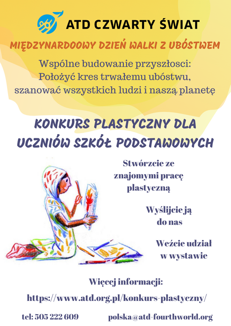 Zapraszamy do udziału w konkursie: "Wspólne budowanie przyszłości: Położyć kres trwałemu ubóstwu, szanować wszystkich ludzi i naszą planetę". Konkurs adresujemy do uczniów szkół podstawowych kl. 1-8. Polega na wykonaniu pracy plastycznej w dowolnej formie. Praca musi być wykonana w grupie od 2 do max. 30 osób. Pracę plastyczną należy dostarczyć do 17 stycznia 2022 roku na adres stowarzyszenia ATD Czwarty Świat. W naszym konkursie każdy jest wygranym, dlatego pragniemy zorganizować wystawę wszystkich prac i wyróżnić wszystkich uczestników.