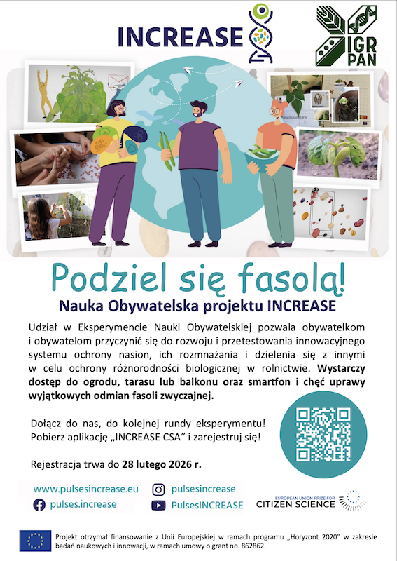 Dobra wiadomość – wciąż można dołączyć i wziąć udział w praktycznych działaniach badawczych! Pasjonaci ogrodnictwa, miłośnicy jedzenia oraz osoby ciekawe świata mogą zarejestrować się do Eksperymentu Nauki Obywatelskiej INCREASE do 28 lutego 2026 r. za pośrednictwem aplikacji INCREASE CSA. Wystarczy zamiłowanie do roślin strączkowych, smartfon oraz miejsce do uprawy fasoli. Osoby otrzymują zestaw nasion różnych odmian fasoli, poznają w praktyce cechy roślin, dokumentują swoje obserwacje w aplikacji oraz mogą dzielić się nasionami i przepisami kulinarnymi z innymi naukowcami obywatelskimi w całej Europie.