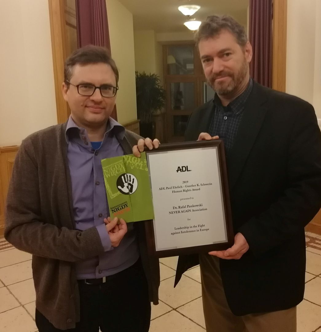 Współzałożyciel Stowarzyszenia „NIGDY WIĘCEJ” Rafał Pankowski został uhonorowany tegoroczną Nagrodą Praw Człowieka im. Paula Ehrlicha i Gunthera K. Schwerina. Wyróżnienie zostało ustanowione w 1998 r. przez amerykańską Ligę Przeciwko Zniesławieniu (Anti-Defamation League) w celu uhonorowania osób walczących z antysemityzmem w Europie. Dyrektor ADL ds. europejskich Andrew Srulevitch wręczył nagrodę podczas wizyty w Polsce 6 lutego 2019 r.