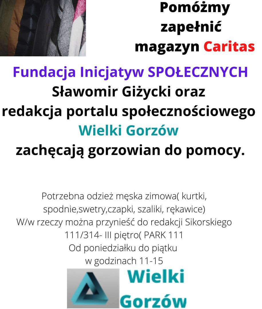 Wspólnie z portalem społecznościowym Wielki Gorzów zbierają: kurtki, spodnie, swetry, czapki, szaliki i czapki, które trafią do magazynu Caritas w Gorzowie Wlkp.