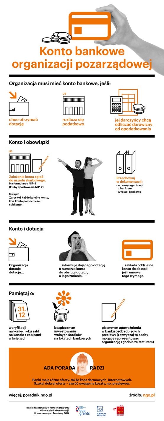 Organizacje dysponujące środkami finansowymi powinny mieć rachunek (konto) w banku. Kiedy należy je założyć i o czym należy pamiętać przy jego zakładaniu oraz używaniu? Zapoznaj się z naszą infografiką.