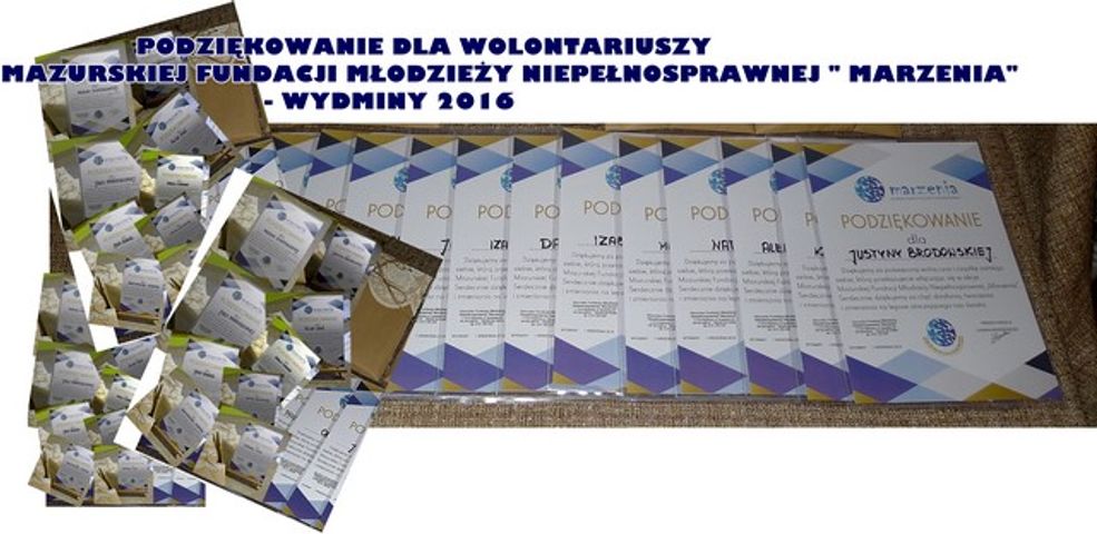 Podczas uroczystości rozpoczęcia roku szkolnego 2016/2017 w ZSO w Wydminach w obecności dyrekcji szkoły, nauczycieli, wójta gminy Wydminy i jego zastępcy, uczniów i rodziców - Mazurska Fundacja Młodzieży Niepełnosprawnej „Marzenia” uroczyście podziękowała swym wolontariuszom za współpracę, pomoc.