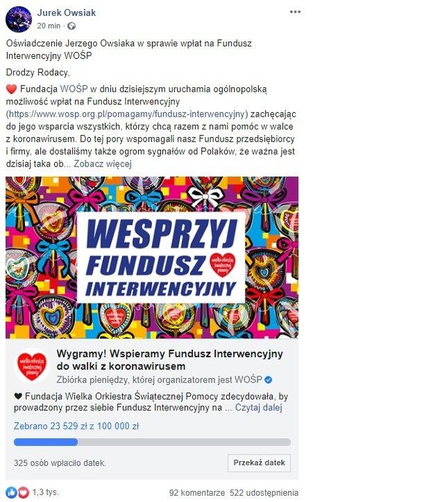 O otwarciu Funduszu poinformował prezes zarządu WOŚP Jerzy Owsiak w opublikowanym dziś oświadczeniu: