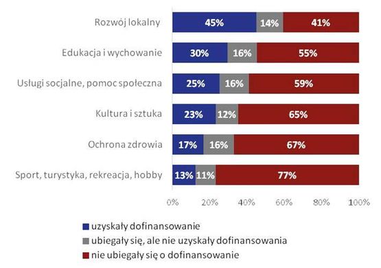 Uzyskanie funduszy z UE w latach 2007–2014 przez organizacje z poszczególnych branż ma ścisły związek z tym, na jakie typy działalności te środki są przeznaczone. Najczęściej korzystały z nich organizacje zajmujące się rozwojem lokalnym (aplikowało 59% organizacji, a 45% co najmniej raz uzyskało dofinansowanie) oraz edukacją i wychowaniem (aplikowało 46% organizacji, a 30% udało się dzięki przyznanym środkom zrealizować przynajmniej jeden projekt). Najrzadziej o środki europejskie ubiegały się organizacje z branży sportu, turystyki, rekreacji i hobby – wnioski złożyło 24% organizacji, a dofinansowanie otrzymało 13%.