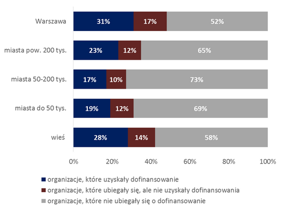 Warto zwrócić uwagę na zróżnicowanie w korzystaniu ze środków unijnych ze względu na lokalizację siedziby organizacji. Nie jest zaskoczeniem, że najczęściej po środki europejskie aplikują organizacje z Warszawy (48% się o nie ubiegało, a 30% choć raz otrzymało dofinansowanie), ale już mniej oczywiste jest to, że na drugim miejscu pod względem częstości składania aplikacji i realizowania projektów z dofinansowaniem unijnym są stowarzyszenia i fundacje z terenów wiejskich – 42% wiejskich organizacji składało wnioski o środki europejskie, a 28% organizacji je otrzymało.