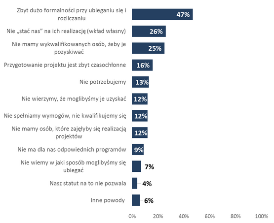 27% organizacji stwierdziło, że nie zamierza aplikować o środki z Unii Europejskiej w ramach nowej perspektywy na lata 2014–2020. Najważniejszymi powodami, które zniechęcają organizacje do ubiegania się o fundusze UE, są formalności i biurokracja związane z procesem aplikacyjnym oraz dokumentacją i sprawozdawczością, brak środków na wkład własny lub obawa przed brakiem płynności finansowej w trakcie realizacji projektu, a także brak wykwalifikowanych osób, które zajęłyby się przygotowaniem wniosku.