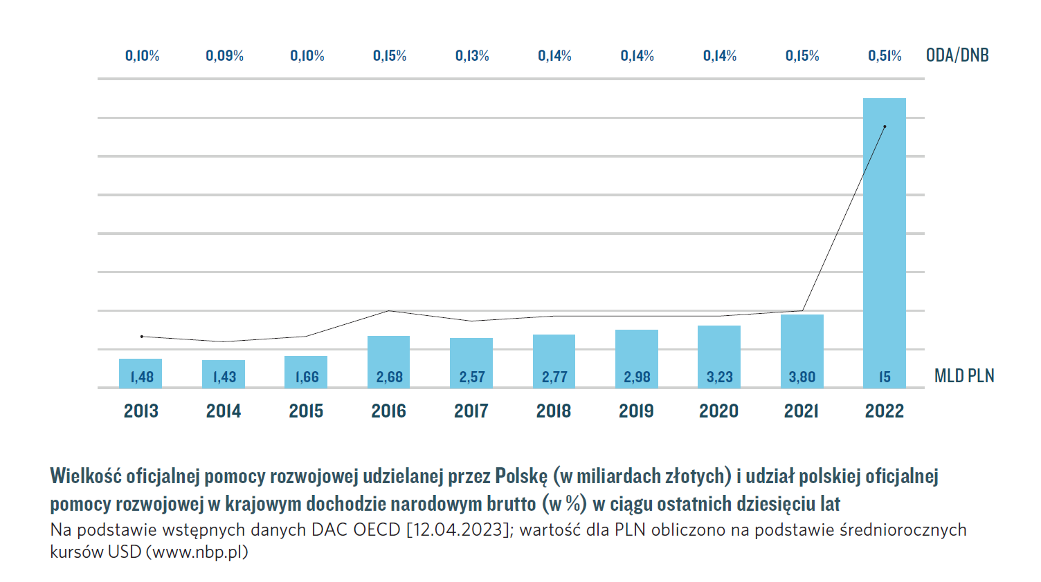 Całkowite wydatki na pomoc rozwojową w 2022 r. wyniosły ponad 15 mld zł, czyli wzrosły o 11,2 mld zł. Polska ODA stanowiła w roku poprzednim 0,51% dochodu narodowego brutto, wobec średniej w ostatnim dziesięcioleciu na poziomie 0,14-0,15% ODA/DNB.