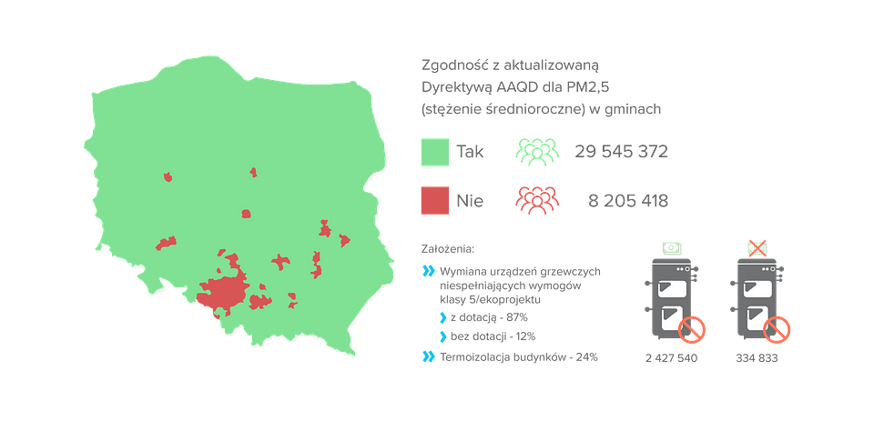 Utrzymanie takiego tempa wymiany sprawi, że po zakończeniu tego procesu blisko 30 mln Polaków będzie mieszkało na obszarach spełniających zaostrzone normy jakości powietrza, zgodne z najnowszymi wytycznymi WHO, które zostały też zaproponowane przez Komisję Europejską (rewizja unijnej dyrektywy AAQD). Obecnie tak czystym powietrzem oddycha zaledwie 2 miliony mieszkańców Polski.