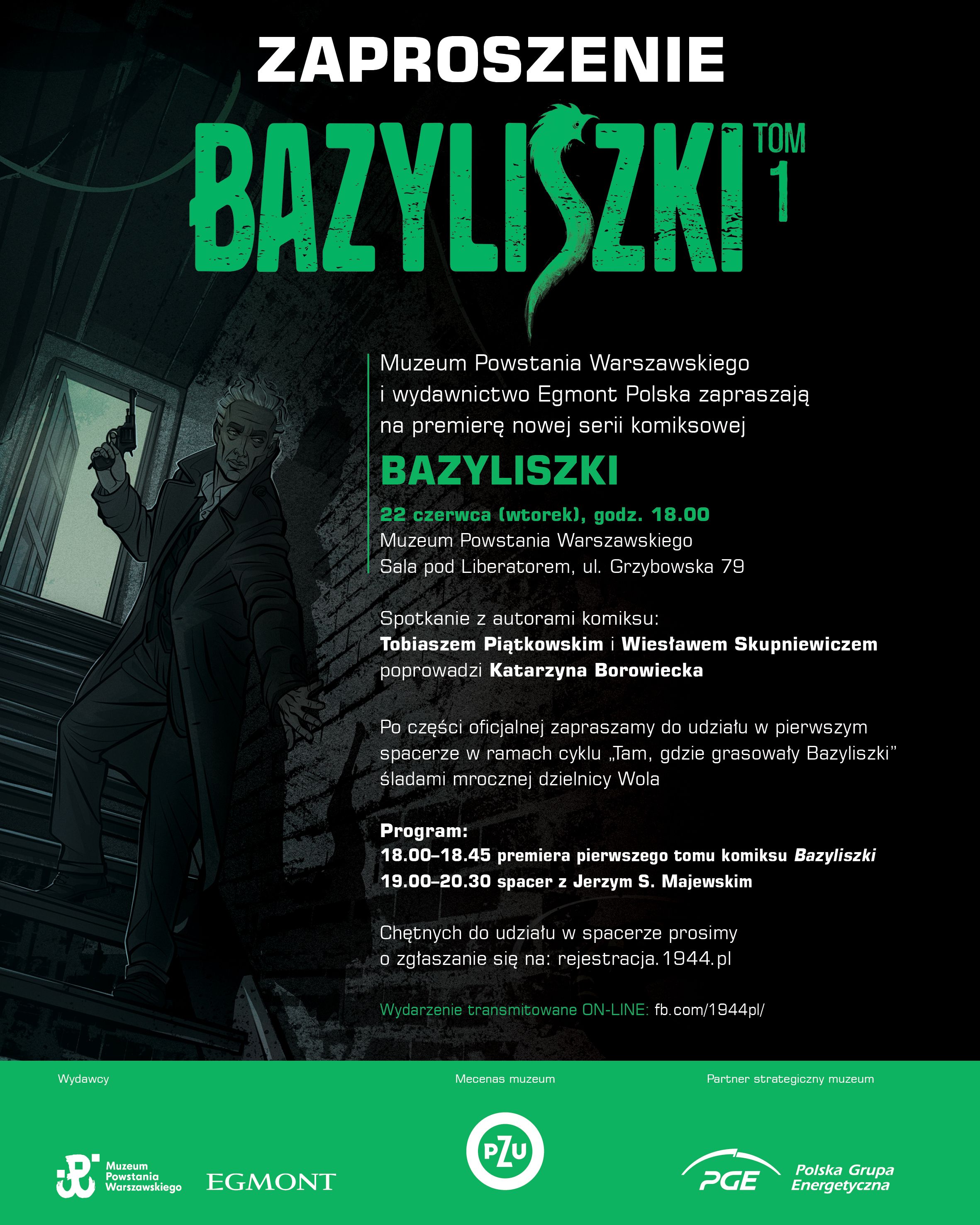 Wydawnictwo Egmont Polska, we współpracy z Muzeum Powstania Warszawskiego wydało pierwszy tom cyklu „Bazyliszki”. Ta komiksowa opowieść osadzona w realiach przedwojennej Warszawy jest zaproszeniem do barwnego świata lat 30. To historia o mieście na progu nowoczesności i o ludziach, którzy tworzyli kolorową mozaikę największej metropolii II Rzeczypospolitej. Autorem scenariusza jest Tobiasz Piątkowski, a rysunki stworzył Wiesław Skupniewicz.