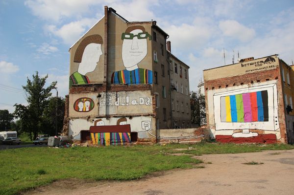 W drugiej odsłonie muralu wszystko powyższej opisane zestawiam z wielkim telewizorem wypełnionym obrazem kontrolnym. To on rozgrywa grę, a do tego kabel z wtyczką i kontakt- są niepołączone. Każdy element mojej pracy ma znaczenie, nie jest przypadkowy. Telewizor w większości domów w Polsce jest równoprawnym członkiem rodziny, często nawet najważniejszym. Jest odskocznią, a za razem uzależnieniem. Będąc w różnych domach podczas wizyt, odwiedzin, telewizor nieustannie „nadaje”, odrywa scenki, przyciąga, reorganizuje moment spotkania. Ustawia jego program po swojemu.