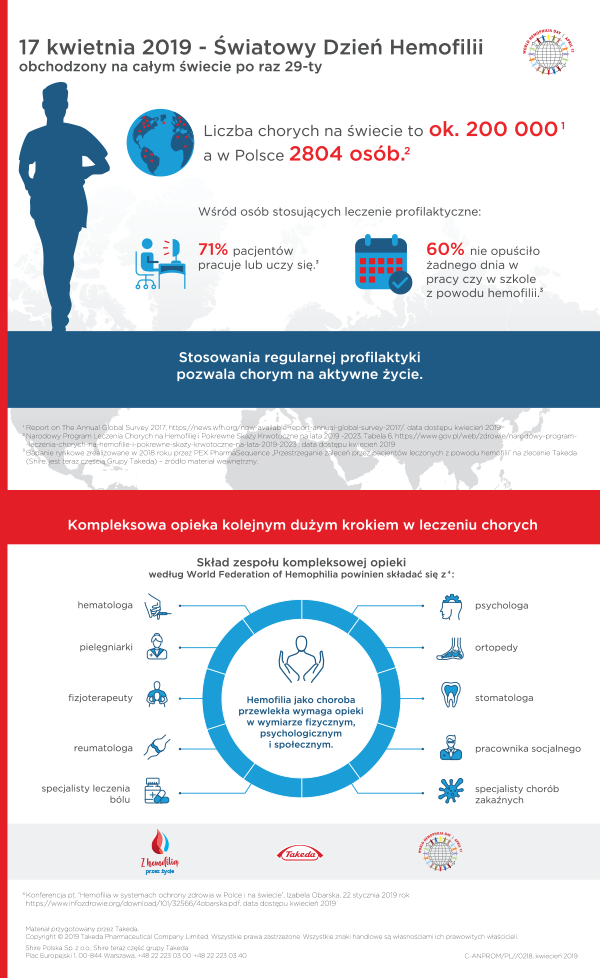 W związku ze Światowym Dniem Hemofilii, na zlecenie Takeda (Shire, teraz część Grupy Takeda), rusza akcja „Z hemofilią przez życie”. Zadaniem jest realizacja działań informacyjno - edukacyjnych skierowanych do ogółu społeczeństwa, których celem jest zwiększenie świadomości Polaków na temat hemofilii.