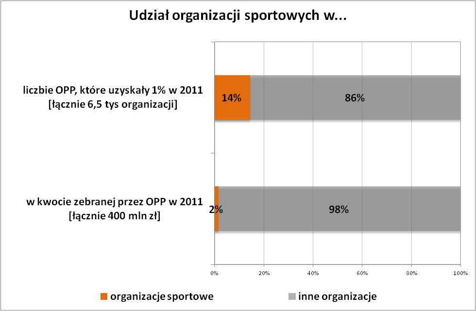 Rzadko natomiast korzystają z wpływów z 1% podatku. Spośród 6,5 tysiąca organizacji, które w 2011 roku uzyskały jakieś środki z 1% podatku za rok 2010, mniej niż tysiąc to organizacje sportowe. Nie tylko jest ich niewiele, lecz także pozyskują bardzo małe pieniądze: przeciętna sportowa organizacja pożytku publicznego uzyskała nieco ponad 3 tys. zł, podczas gdy przeciętna organizacja niesportowa – ponad 6 tys. Jeszcze większe dysproporcje widzimy, gdy spojrzymy na sumy zebranych środków: okazuje się, że spośród 400 milionów zł, które w 2011 roku trafiły do organizacji pożytku publicznego, organizacje sportowe zebrały zaledwie 6,5 miliona.