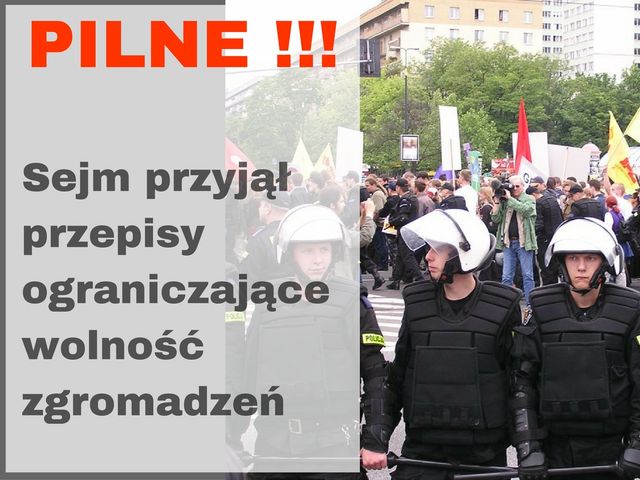 Po burzliwej dyskusji i przerwie w obradach Sejm przyjął ustawę o zmianie ustawy – Prawo o zgromadzeniach, która preferuje manifestacje organizowane przez władze publiczne oraz kościoły. Organizacje pozarządowe oraz Rzecznik Praw Obywatelskich wskazują, że nowe przepisy ograniczają jedno z podstawowych praw człowieka, jakim jest WOLNOŚĆ ZGROMADZEŃ.