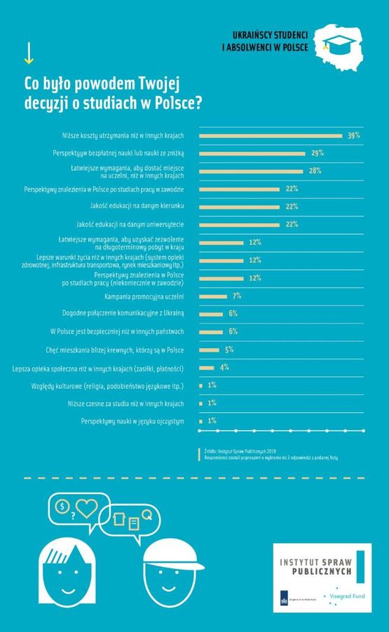 Jak wynika z badania ankietowego, młodzi ludzie z Ukrainy przyjeżdżają do Polski ze względu na niższe koszty życia (39%) i studiów (29%) oraz perspektywy znalezienia pracy w obszarze zgodnym z wykształceniem (22%).