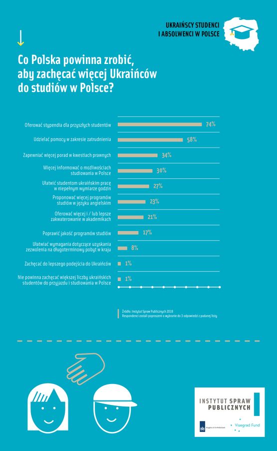 Postulatem samych studentów wobec polskiego państwa jest głównie zapewnianie stypendiów (74%) oraz wsparcia w znalezieniu pracy (58%). Obecnie ponad co czwarty badany przyznaje, że otrzymuje stypendium, większość utrzymują rodzice (58%). Oficjalne statystyki wskazują, że stypendium w 2018 roku otrzymywało około 1900 ukraińskich studentów.