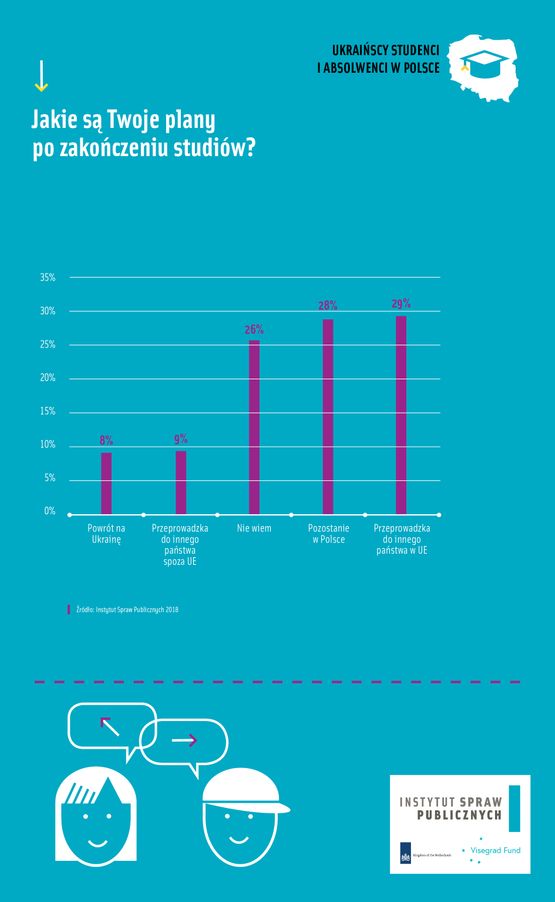 Zbliżony odsetek respondentów po ukończeniu studiów na polskiej uczelni planuje przeprowadzić się do innego państwa Unii Europejskiej (29%) i zostać w Polsce (28%). Podobna jest liczba tych, którzy jeszcze nie wiedzą, czy wyjadą (26%). Powrót do ojczyzny nie wydaje się interesującą możliwością – wybiera ją tylko 8% pytanych. Ci, którzy planują pozostać w Polsce stosunkowo najczęściej wskazują jako powód fakt, że mogą tu zarabiać więcej niż na Ukrainie (24%).