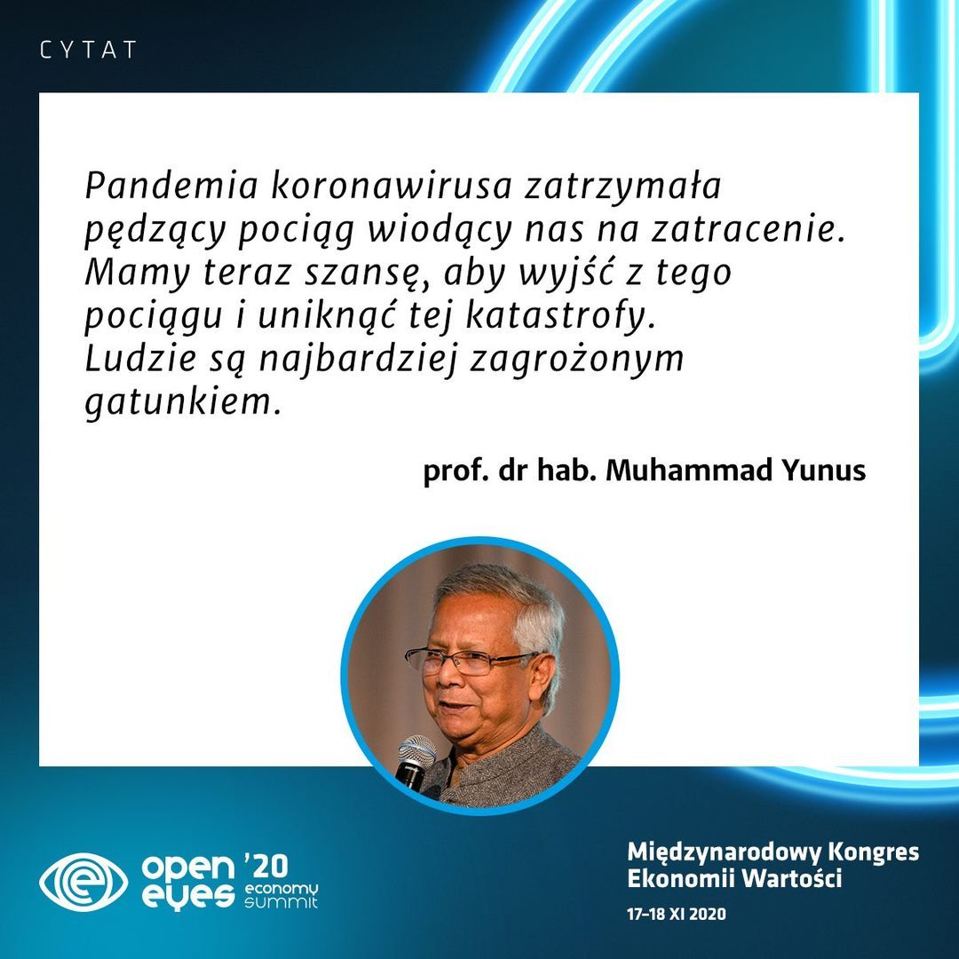 – Dlaczego mielibyśmy wracać do sytuacji sprzed pandemii? Ten świat sprzed pandemii nie był dobrym światem, był światem potwornym. To był świat globalnego ocieplenia, kryzysu klimatycznego. Pandemia koronawirusa zatrzymała pędzący pociąg wiodący nas na zatracenie. Mamy teraz szansę, aby wyjść z tego pociągu i uniknąć tej katastrofy. Ludzie są najbardziej zagrożonym gatunkiem – mówił podczas sesji otwarcia prof. Yunus.