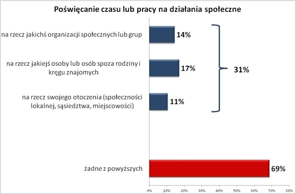 Tak więc gdy weźmiemy pod uwagę zarówno zaangażowanie wolontariackie w stowarzyszeniach i fundacjach, jak i działania nieformalne, okaże się, że aktywna jest blisko połowa (45%) osób z wykształceniem wyższym i mniej niż jedna trzecia (29%) tych z wykształceniem średnim lub podstawowym.