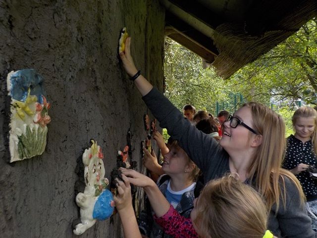 Dzieci i młodzież ze Specjalnego Ośrodka Szkolno-Wychowawczego dla Dzieci Niewidomych i Niedowidzących w Krakowie razem z dziećmi i młodzieżą ze szkół wiejskich z Gminy Wielka Wieś oraz mieszkańcy wsi Prądnik Korzkiewski stworzyli wspólnie MOZAIKĘ ceramiczną na Zielonym Domu, obiekcie wybudowanym ze słomy i gliny. Realizację w plenerze poprzedził cykl warsztatów i zajęć podczas, których uczestnicy realizowali swoje kreacje artystyczne w nowo poznanej technice.