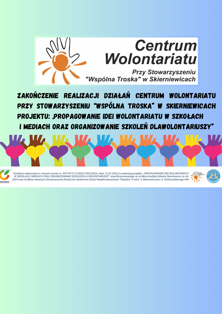W dniu 30.06.2024 r. kończymy realizację działań Centrum Wolontariatu przy Stowarzyszeniu „Wspólna Troska” w Skierniewicach zaplanowanych w okresie 01.04.2024 r. – 30.06.2024 r. w ramach umowy nr. DOT-W/12112/RGS/1063/2024 z dnia 15.03.2024 na realizację projektu: „Propagowanie idei wolontariatu w szkołach i mediach oraz organizowanie szkoleń dla wolontariuszy”.