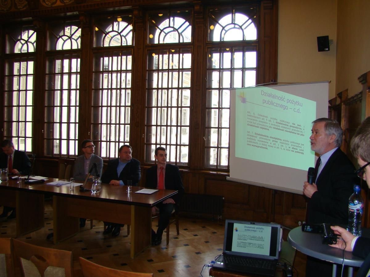 Pierwszy referat na temat współpracy finansowej i pozafinansowej administracji publicznej z organizacjami pozarządowymi w kontekście proponowanych zmian w ustawie o pożytku publicznej i wolontariacie wygłosił Krzysztof Więckiewicz, dyrektor Departamentu Pożytku Publicznego w Ministerstwie Pracy i Polityki Społecznej. Jak wskazywał dr Więckiewicz problem z niektórymi, przewidzianymi prawem, narzędziami finansowymi leży w złej kondycji ekonomicznej samorządów. O ile sprawnie działają takie modele, jak pozyskiwanie środków z różnego rodzaju grantów, o tyle praktycznie niemożliwe jest uzyskanie pożyczki bądź gwarancji udzielanej organizacji pozarządowej przez JST. Bardzo istotną kwestią poruszaną przed Więckiewicza był również model małych zleceń oraz cedowania zadań publicznych na organizacje pozarządowe przez organy samorządowe. Z doświadczeń i badań DPP wynika bowiem, że NGO nie tylko lepiej i taniej wykonują te zadania, ale sam zastrzyk finansowy, który spływa do takiej organizacji pozwala na rozwój jej zasobów instytucjonalnych oraz kapitału społecznego. Warto również podkreślić, iż według Krzysztofa Więckiewicza to właśnie kapitał społeczny jest niejednokrotnie ważniejszy od samego zadania, jakie jest realizowane. Argumentował, że w obecnych czasach, nawet duże przedsiębiorstwa niejednokrotnie decydują się na podjęcie inwestycji i działań w danym miejscu, biorą pod uwagę właśnie kapitał społeczny a nie jak wcześniej ludzki tudzież inne zasoby ekonomiczne. Jeżeli chodzi o same zmiany zakładane w nowelizacji, bardzo ważnym elementem stanowiącym wsparcie finansowe dla NGO będzie możliwość sprzedaży dóbr pochodzących z darowizn. Innym bardzo istotnym instrumentem jest regranting, czyli kaskadowe przekazywanie środków publicznych organizacjom pozarządowym, tak by to one, w efektywny sposób realizowały zadania publiczne. Więckiewicz przedstawił przykład, iż w ramach regrantingu powstają nawet konsorcja NGO tak by realizacja celów zadania mogła objąć całe województwa, a środki publiczne wspierały kilka organizacji naraz. Nowe praktyki DPP dopuściły do środków publicznych również grupy nieformalne. MPiPS odnotowuje bardzo duże zainteresowanie tą formą wsparcia, które nadal wzrasta. Korzystają z niej – jak powiedział Więckiewicz – ludzie, którym nie zależy na instytucjonalizacji ich działalności, a na ruchu, jaki ona wywołuje.