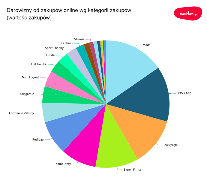 Nieco inaczej wygląda sytuacja w przypadku zakupów z darowizną. Dane zebrane przez FaniMani.pl pokazują, że największe kwoty darowizn organizacje pozyskują z zakupów odzieży i dodatków, sprzętów RTV/AGD, produktów dla zwierzaków, akcesoriów biurowych oraz sprzętu komputerowego. W tym zdecydowanie najwięcej pojedynczych darowizn pochodzi z zakupów dla zwierzaków: na odległym drugim i trzecim miejscu plasują się codzienne zakupy oraz zakupy odzieżowe.