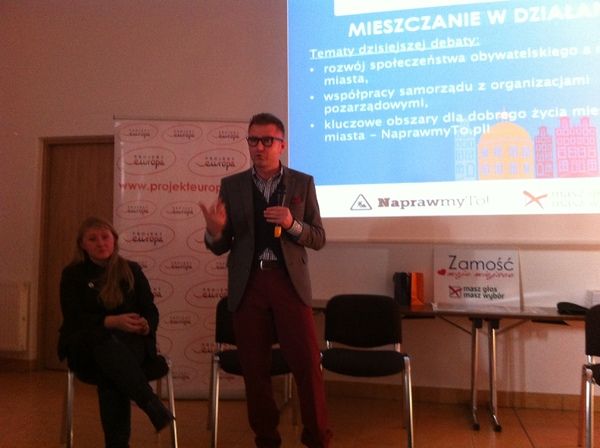Debata Mieszczanie w działaniu, która odbyła się w miniony czwartek (tj. 6.12.2012r.) w Zamościu została zorganizowana przez Stowarzyszenie „Projekt-Europa”. Jej celem była wymiana poglądów na temat roli społeczeństwa obywatelskiego w rozwoju miasta, wagi współpracy samorządu z organizacjami pozarządowymi, a także (a może przede wszystkim) wskazania kluczowych obszarów dla dobrego życia mieszkańców naszego miasta w kontekście funkcjonowania serwisu NaprawmyTo.pl.