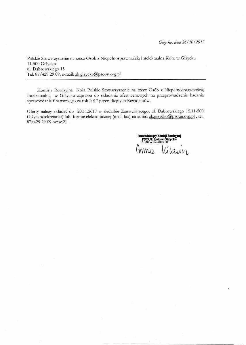Komisja Rewizyjna Koła Polskie Stowarzyszenie na rzecz Osób z Niepełnosprawnością Intelektualną w Giżycku zaprasza do składania ofert cenowych na przeprowadzenie badania sprawozdania finansowego za rok 2017 przez Biegłych Rewidentów.