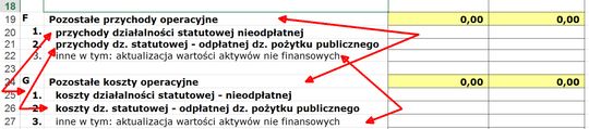 Analogicznie jeśli w sprawozdaniu organizacji pozarządowej znajduje się rozbicie na przychody działalności statutowej nieodpłatnej i przychody działalności statutowej – odpłatnej, to tak samo rozbite będą koszty.