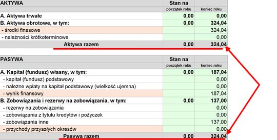 Analizę bilansu trzeba rozpocząć od sprawdzenia sumy bilansowej. Kwota w podsumowaniu tabeli aktywów i kwota w podsumowaniu tabeli pasywów – czyli właśnie suma bilansowa – musi być taka sama, co do grosza. Inaczej mówiąc, aktywa i pasywa musza się zrównoważyć (bilansować). To bardzo ważne! Osoba, która sprawdza sprawozdanie i podpisuje je, powinna zwrócić na to uwagę.