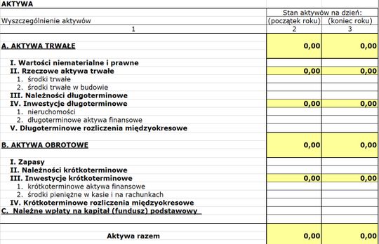 Przykładowy fragment bilansu z podziałem aktywów (wzór dla jednostki małej)
