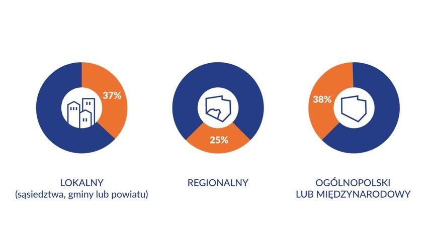 37% organizacji ze swoimi działaniami nie wykracza poza poziom lokalny – działa na poziomie najbliższego sąsiedztwa, gminy bądź powiatu. Regionalny zasięg działań deklaruje 25% organizacji, nieco więcej, bo 28%, działa ogólnopolsko. Warto jednak pamiętać, że większość organizacji prowadzi równolegle działania na różną skalę. Przykładowo, działając na poziomie województwa organizacje są aktywne także na szczeblu gminnym.