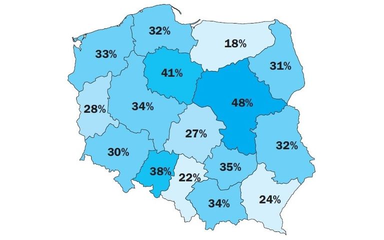 Najrzadziej z pracy stałych, regularnych pracowników korzystają organizacje na Warmii i Mazurach (18%), Śląsku (22%) oraz Podkarpaciu (24%).