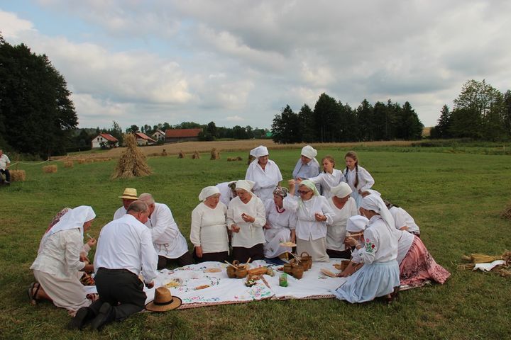 Po ciężkiej pracy w polu, gdy słońce stawało w zenicie, żeńcy przerywali pracę, aby się posilić i odpocząć. I tak też było w inscenizacji żniwnej: po ciężkiej pracy w polu nadszedł czas na odpoczynek, biesiadę przy ognisku i smakowanie lokalnych smakołyków.
