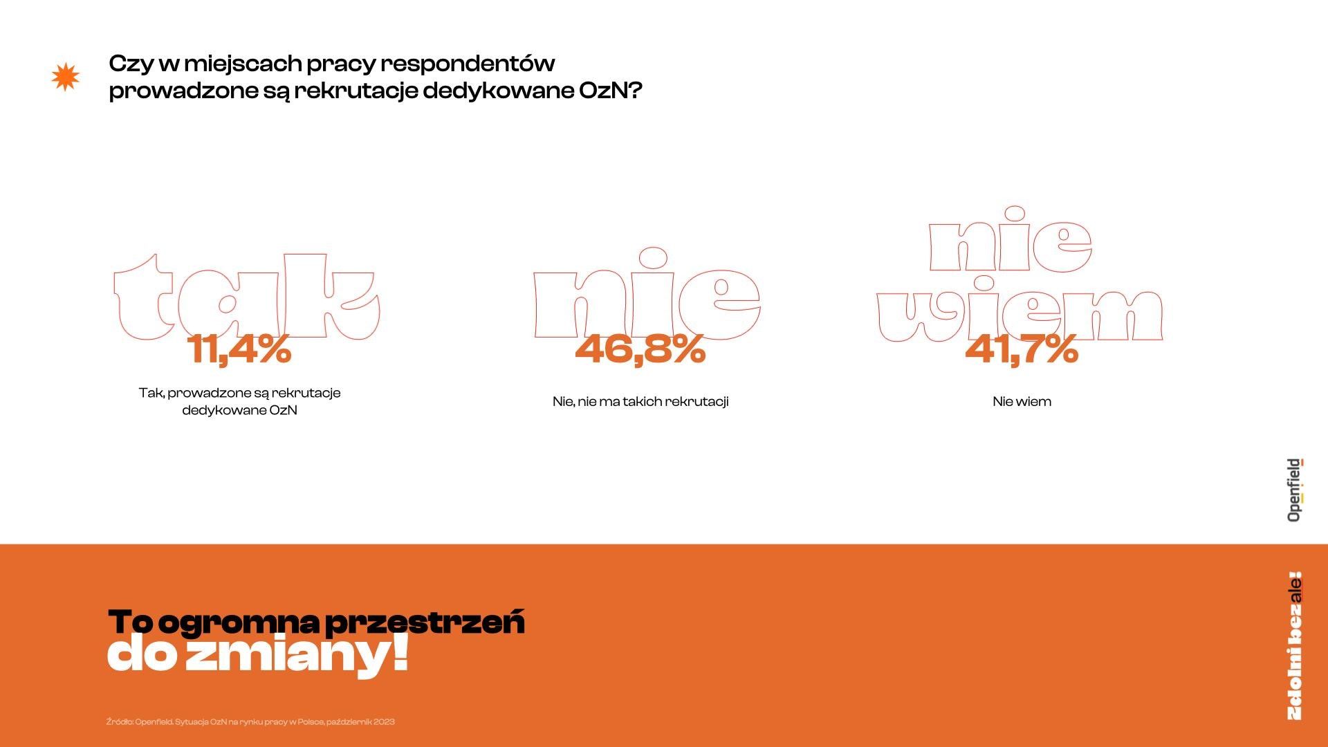 „Zaledwie 11,4% badanych deklaruje, że w ich miejscu pracy prowadzone są rekrutacje dla osób z niepełnosprawnościami. Dlaczego tak niewielu pracodawców się na nie decyduje? Powodów jest wiele. Najczęściej wynika to z niewiedzy i braku świadomości, co do tego jakie korzyści może przynieść firmie zatrudnianie osób z niepełnosprawnościami. Często jest to również konsekwencją obaw, np. przed dodatkowymi kosztami związanymi z dostosowaniem miejsca pracy do potrzeb OzN czy zakupem specjalistycznego sprzętu. Potwierdzają to wyniki badania – 42% pracowników dostrzega obawy pracodawców związane z zatrudnianiem OzN, a 32% deklaruje, że ich pracodawcy nie mają odpowiedniej wiedzy związanej z tym procesem”.