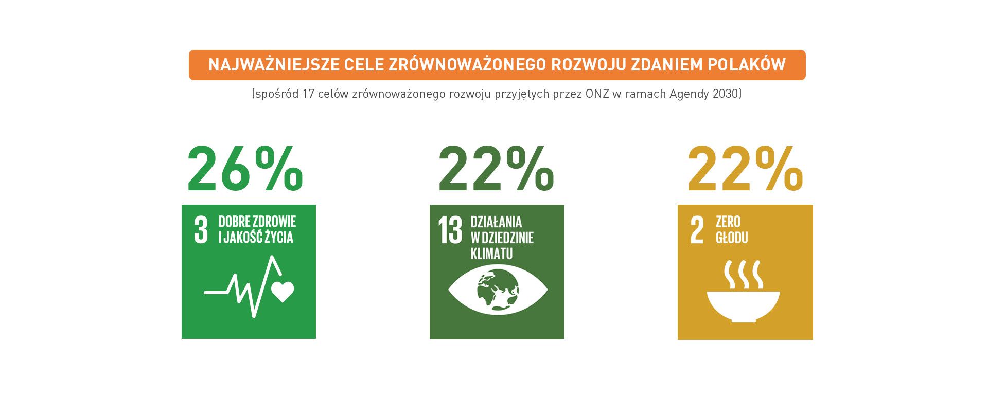 Budowanie zrównoważonego rozwoju w Polsce wymaga przede wszystkim zapewnienia ludziom w każdym wieku zdrowego życia oraz promowania dobrobytu. W kontekście globalnym Polacy uważają, że najpilniejszym zadaniem jest wyeliminowanie głodu oraz zapewnienie bezpieczeństwa żywnościowego. Zwraca też uwagę wysokie znaczenie kwestii klimatycznych.