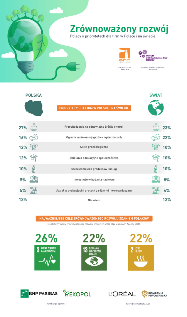 Badanie ARC Rynek i Opinia oraz Forum Odpowiedzialnego Biznesu pokazuje również, jak Polacy postrzegają odpowiedzialność firm za zrównoważony rozwój. Najwyższy procent wskazań otrzymały działania z zakresu ochrony środowiska naturalnego: przechodzenie na odnawialne źródła energii, ograniczanie emisji gazów cieplarnianych oraz akcje pro ekologiczne.