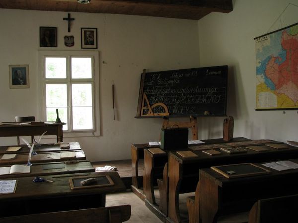 Zajrzyjmy do szkoły. To raczej niewielki budynek. Dwa pomieszczenia. Ławki i tablica są. Kreda taka sama, jak większość z nas jeszcze pamięta. Biurko nauczyciela, mapy, liczydła, których nikt już dziś nie umie obsłużyć, portrety aktualnych w danym czasie i miejscu bohaterów – najczęściej zdjęcia marszałka Piłsudskiego i prezydenta Mościckiego. Obok godło i krzyż.
