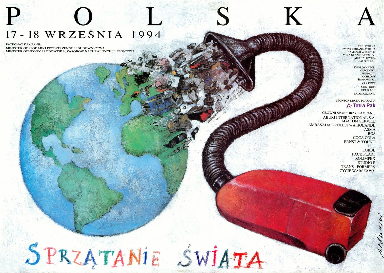 Kolorowe literki na plakacie skreślone jakby ręką dziecka, układają się w napis „Sprzątanie świata”. Czujemy, jak wesoło podrygują w rytm wspólnej pracy uczestników Akcji na rzecz jedynej planety, jaką mamy do życia. Patrząc na tę znakomitą kompozycję, jesteśmy niemal pewni, że po Akcji będzie zdrowiej i czyściej. Upewniają nas w tym nakreślone ręką Mistrza Pągowskiego błękity i zielenie, które wyłaniają się zza wyssanych przez odkurzacz ziemskich śmieci.