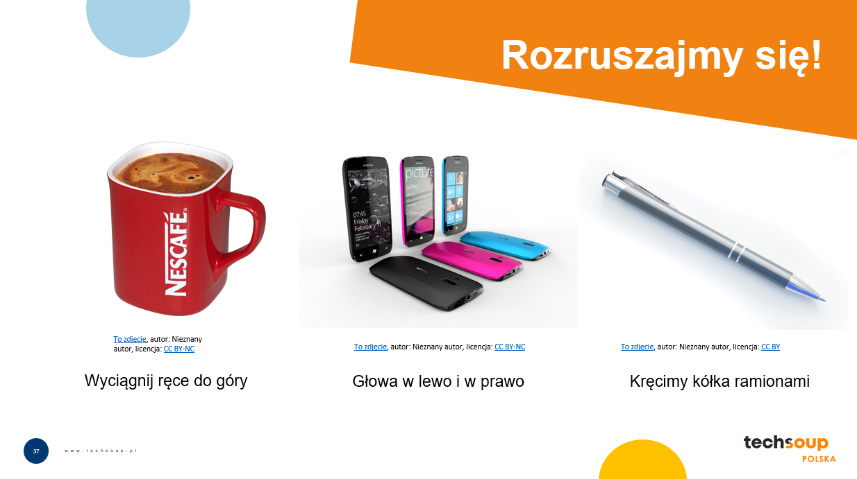 Przyszykujcie slajd z kilkoma przedmiotami i przypisanymi im komendami. Pokazujcie je po kolei do kamery, a grupa wykonuje kilka ćwiczeń rozciągających :)