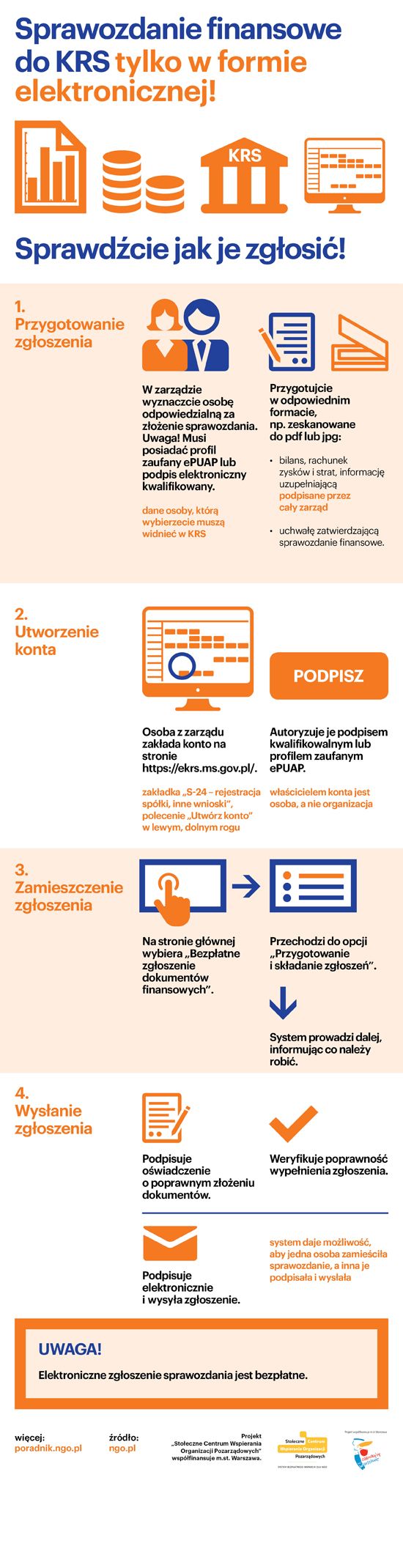 15 marca 2018 roku weszły w życie przepisy zmieniające ustawę o Krajowym Rejestrze Sądowym. Organizacje – przedsiębiorcy składają sprawozdanie finansowe tylko w jeden sposób – drogą elektroniczną. Zgłoszenie sprawozdania online wymaga podpisu elektronicznego. Może być on złożony przez profil zaufany ePUAP lub podpis elektroniczny kwalifikowany.