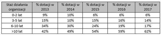 Sprawdziliśmy „wiek” organizacji w momencie otrzymania dotacji od MKiDN. Okazuje się, że coraz rzadziej Ministerstwo dotuje organizacje najmłodsze, powstałe co najwyżej dwa lata przed rozstrzygnięciem konkursu. Istotnie spadł odsetek ministerialnych środków, które przypadały organizacjom działającym 6-10 lat w momencie rozstrzygnięcia konkursu. Z kolei sukcesywnie wzrasta odsetek sumy przyznawanej najbardziej doświadczonym, „starym” organizacjom stażu dłuższym niż 10 lat.
