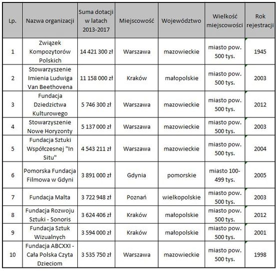 W latach 2013-2014 dziesięć organizacji, które otrzymały największe sumy dotacji, zgarnęło 15% wszystkich środków rozdysponowanych przez Ministerstwo. W kolejnych latach ten odsetek prezentujący koncentrację środków nieco spadał, by w 2017 roku znowu osiągnąć stan z 2013 roku.