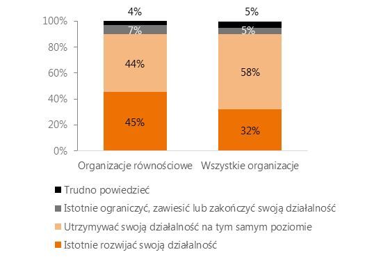 Mimo tak krytycznej oceny warunków działania organizacji w 2017 roku i dość pesymistycznego nastawienia co do przyszłości, aż 45% organizacji równościowych chce w najbliższym czasie rozwijać swoją działalność. Taka sama grupa organizacji (44%) jest nastawiona na „przetrwanie”, czyli utrzymanie swojej działalności na tym samym poziomie.