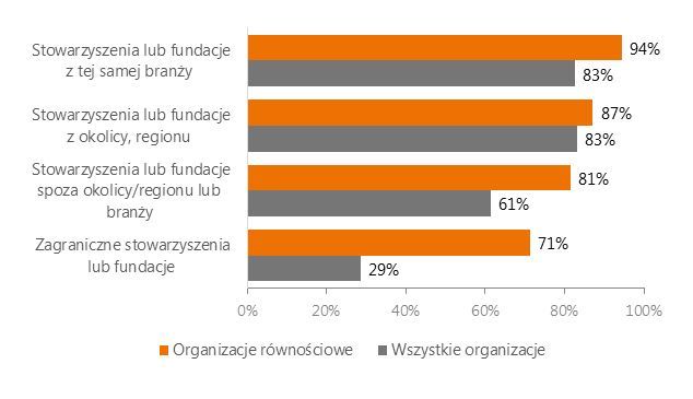 W tej sytuacji wsparciem okazuje się otoczenie organizacji, w szczególności środowisko pozarządowe. Organizacje równościowe najczęściej utrzymują relacje z innymi stowarzyszeniami i fundacjami działającymi w branży równościowej (94% ma tego typu relacje). Bardzo ważne, szczególnie na tle kontaktów wszystkich organizacji, są dla nich relacje z zagranicznymi stowarzyszeniami i fundacjami – ma je 71% równościowych i tylko 29% wszystkich organizacji.