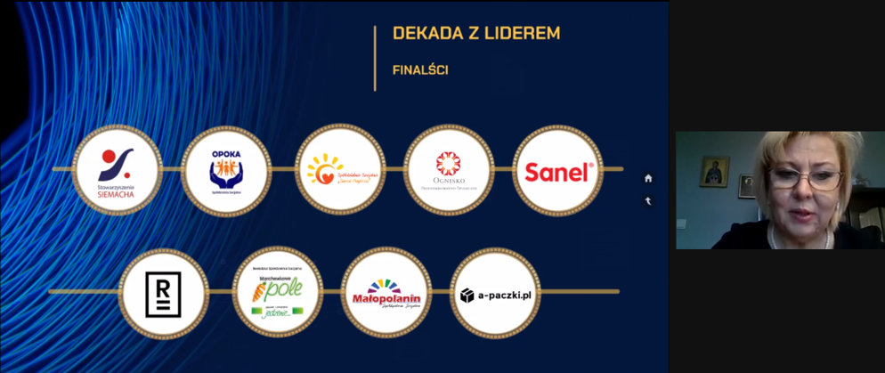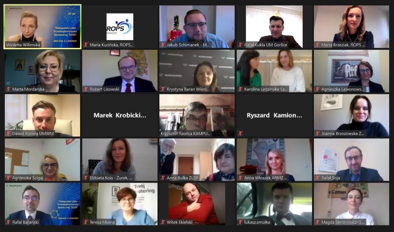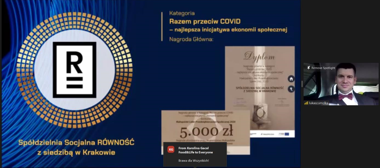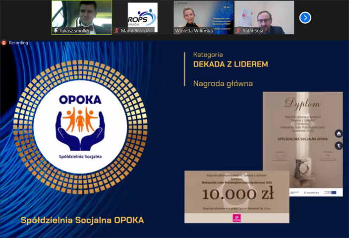 Uroczystego ogłoszenia zwycięzców konkursu, w trakcie II plenarnego posiedzenia Małopolskiego Komitetu Rozwoju Ekonomii Społecznej (ciała doradczego Zarządu WM ds. ekonomii społecznej) zorganizowanego w przestrzeni wirtualnej przez Regionalny Ośrodek Polityki Społecznej w Krakowie, dokonali Pan Łukasz Smółka – Wicemarszałek Województwa Małopolskiego wraz z Przewodniczącą Małopolskiego Komitetu Rozwoju Ekonomii Społecznej Marta Mordarska.