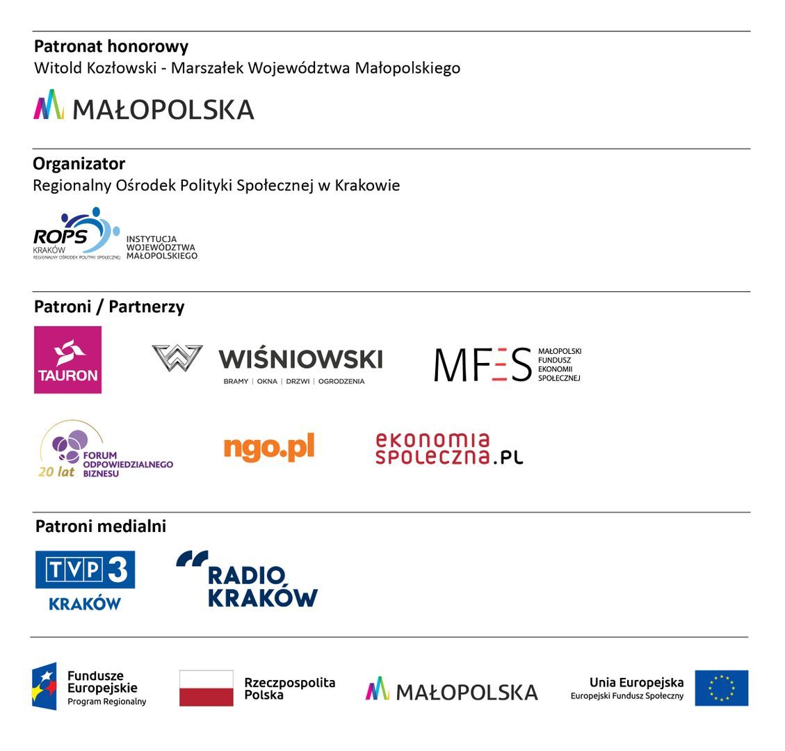 Patronat honorowy nad wydarzeniem objął Witold Kozłowski – Marszałek Województwa Małopolskiego. Inicjatywie patronowali także Forum Odpowiedzialnego Biznesu, Małopolski Fundusz Ekonomii Społecznej, Portal NGO.pl,Portal EkonomiaSpoleczna.pl, TVP3 Kraków, Radio Kraków.