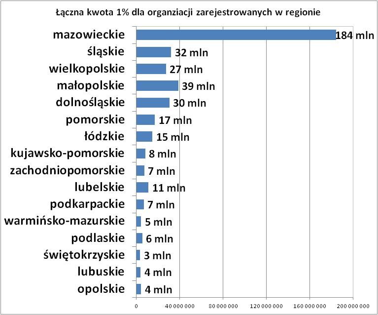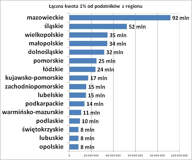 Dane Ministerstwa Finansów pokazują, że z 400 mln, które w zeszłym roku Polacy przekazali organizacjom, połowa pochodziła od podatników z zaledwie czterech regionów: Mazowsza (92 mln zł), Śląska (52 mln zł), Wielkopolski (35 mln zł) i Małopolski (34 ml zł). Natomiast cztery województwa, z których płynie najmniej pieniędzy dla OPP, łącznie przekazują mniej niż jedną dziesiątą z ogólnopolskiej kwoty 1%. Te województwa to: opolskie, lubuskie, świętokrzyskie (wszystkie trzy po zaledwie ok. 8 mln zł) i podlaskie (nieco ponad 9 mln zł). W 2010 roku ranking województw był niemal identyczny – te same województwa były w czołówce, te same też zamykały zestawienie.